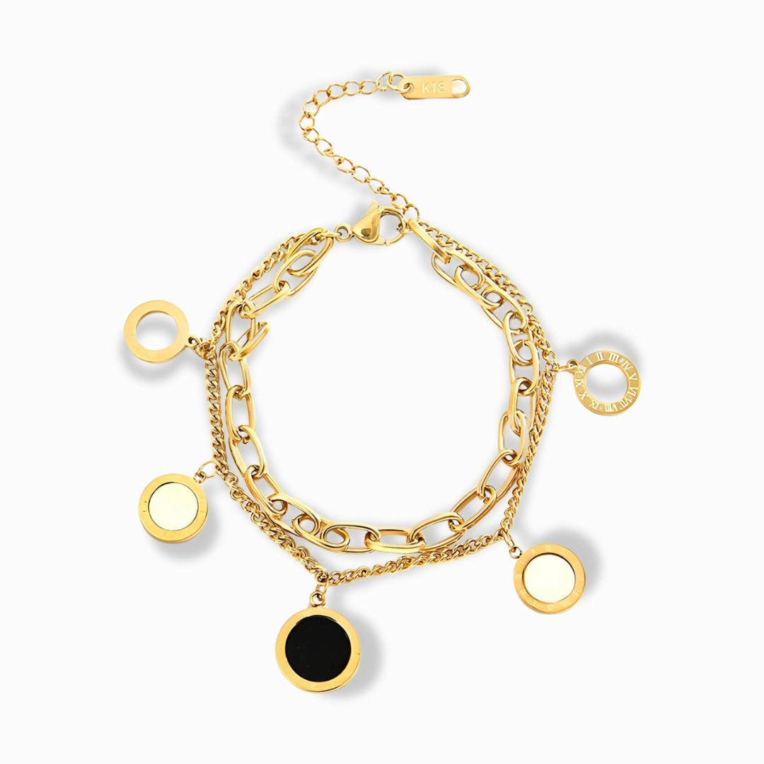 A trendy multi-charm bracelet featuring layered gold-plated chains with modern circular charms. Waterproof, tarnish-free, and adjustable for the perfect fit.