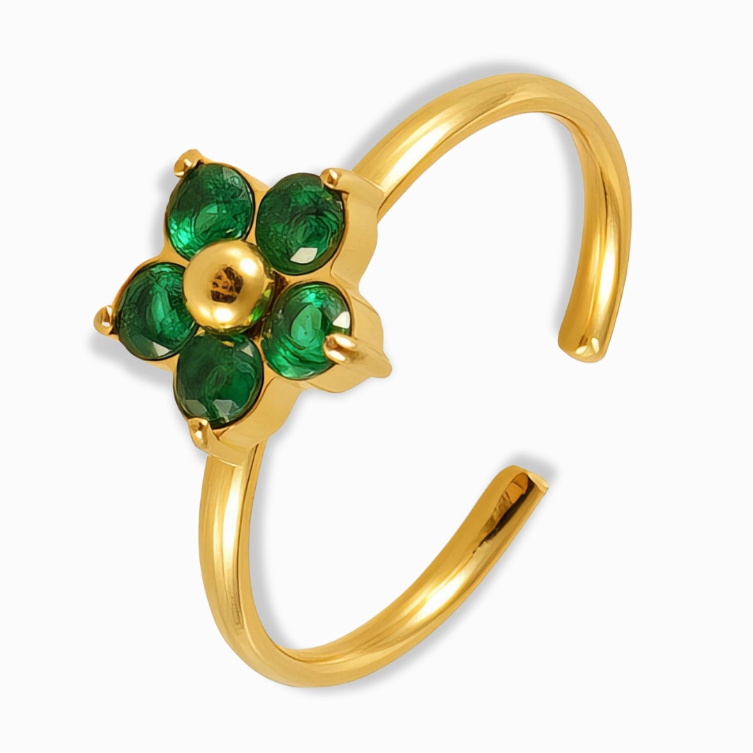 Glozya 18K Gold Plated Adjustable Green CZ Flower Ring – A delicate floral ring featuring vibrant green CZ stones, crafted in 18K gold-plated stainless steel. Adjustable, waterproof, tarnish-free & hypoallergenic—perfect for an elegant, nature-inspired look.
