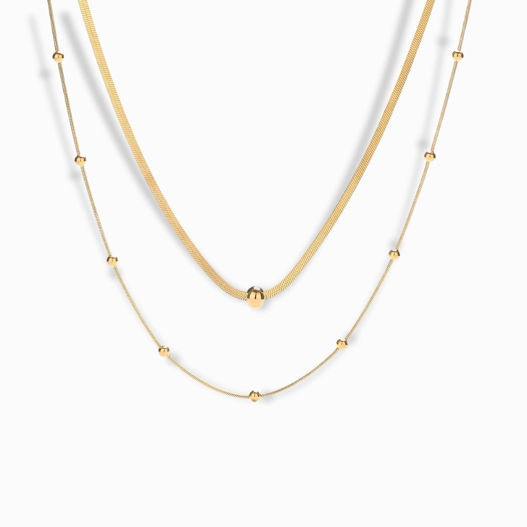 A stylish 18K gold-plated layered chain necklace featuring a snake chain and beaded detailing. Hypoallergenic, waterproof, and tarnish-resistant for effortless elegance.