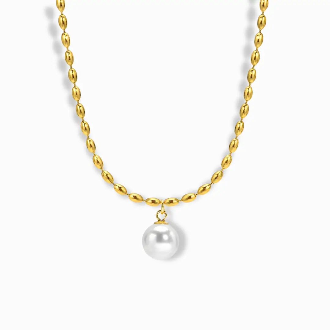 A timeless pearl drop necklace with 18K gold plating. Hypoallergenic, waterproof, and perfect for both casual and formal wear.
