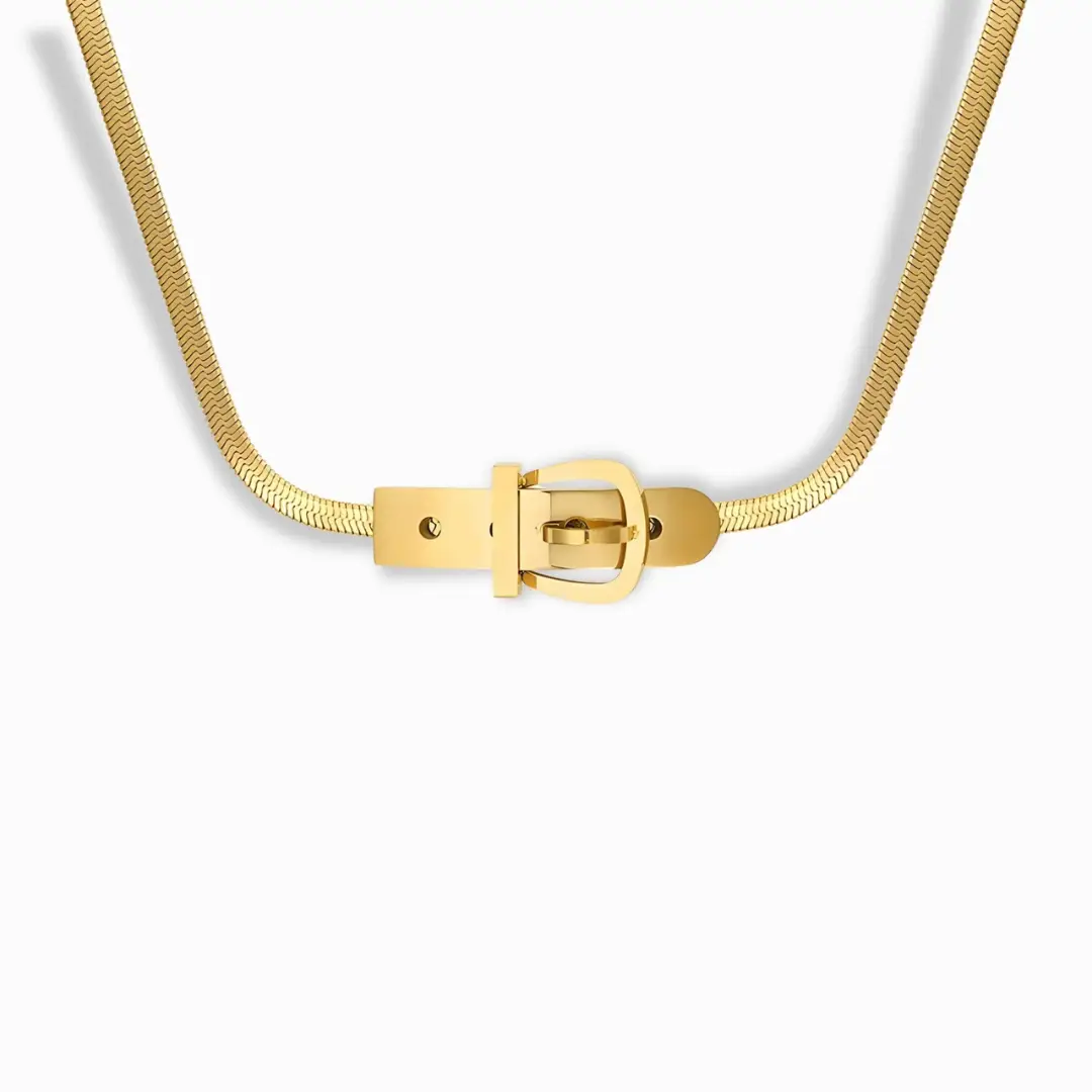 A trendy belt buckle pendant necklace crafted in stainless steel with 18K gold plating. Waterproof, hypoallergenic, and perfect for a bold fashion statement.